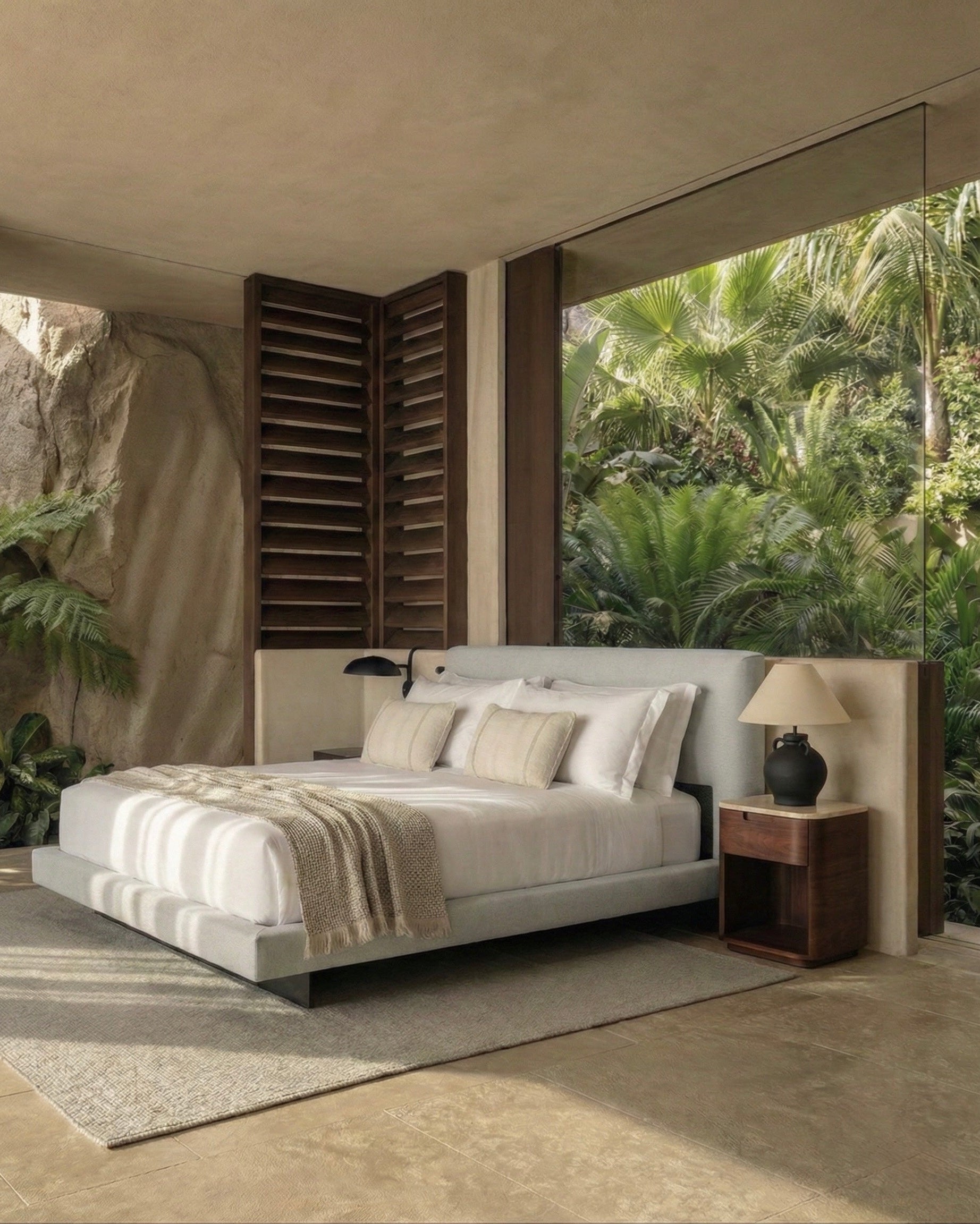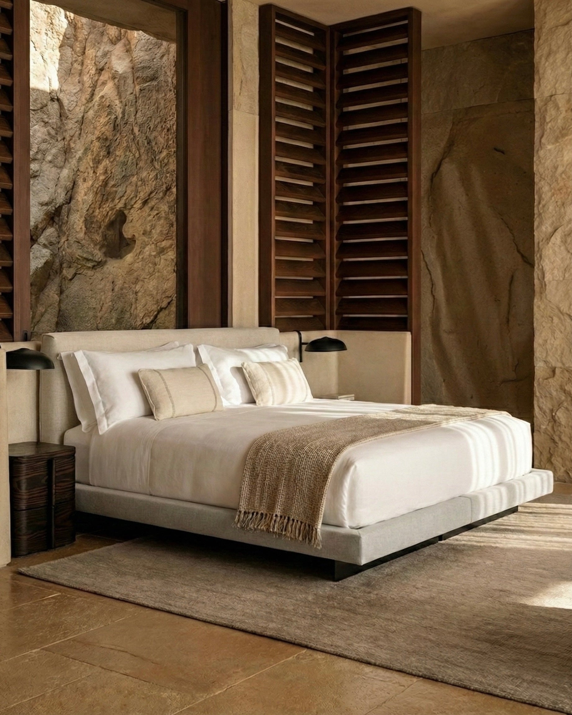 The Philo Bed Frame strips away excess and focuses on proportion, material, and balance. A generous upholstered headboard meets a low, grounded base, creating a strong horizontal silhouette that anchors the room without overwhelming it.