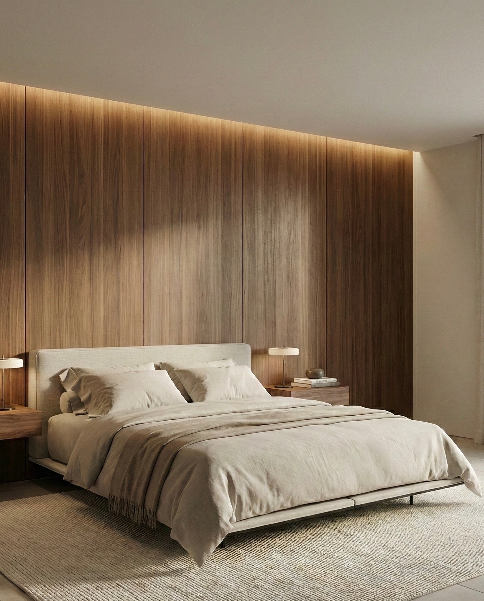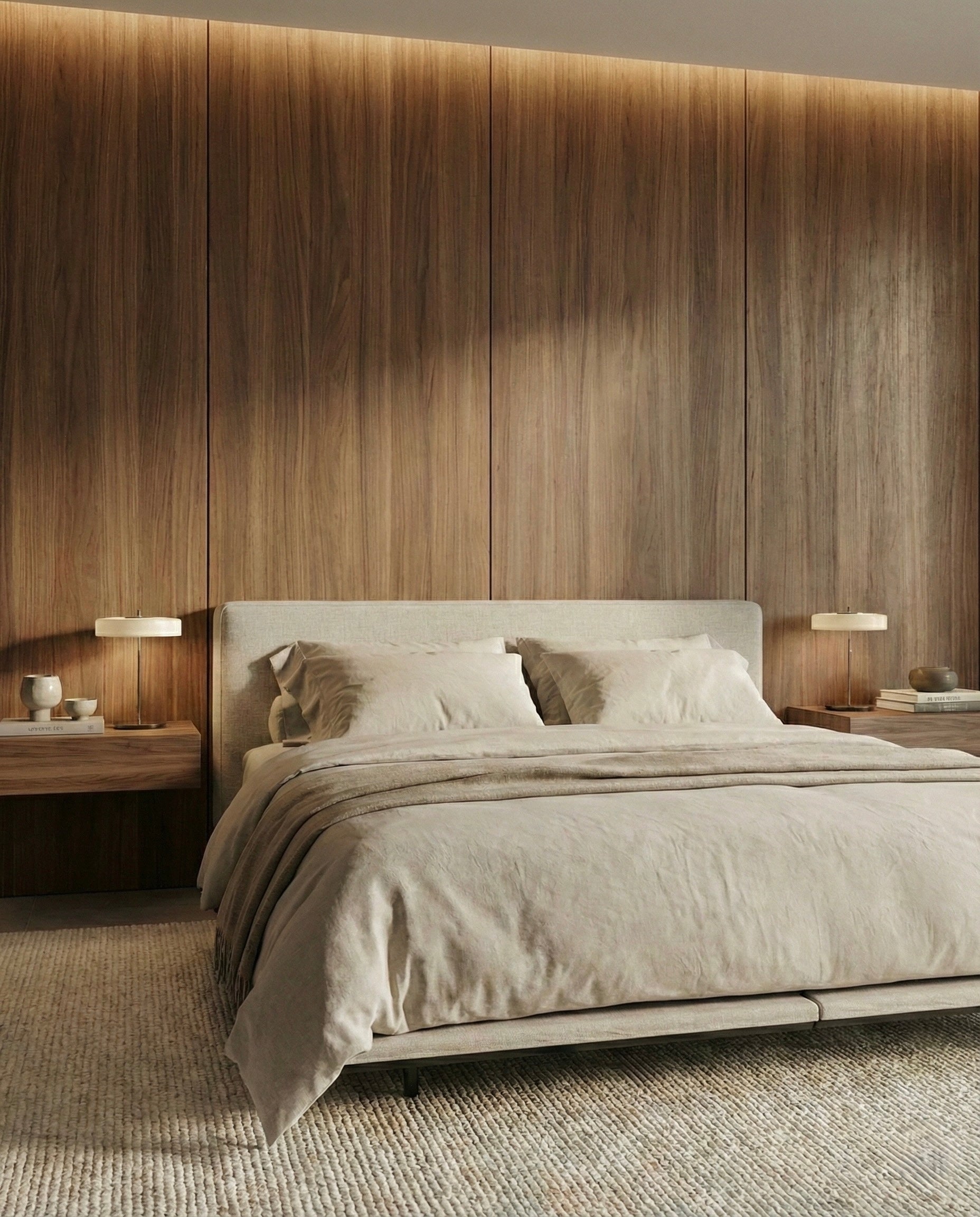 The extended frame creates a calm, grounded look while visually enlarging the bedroom.