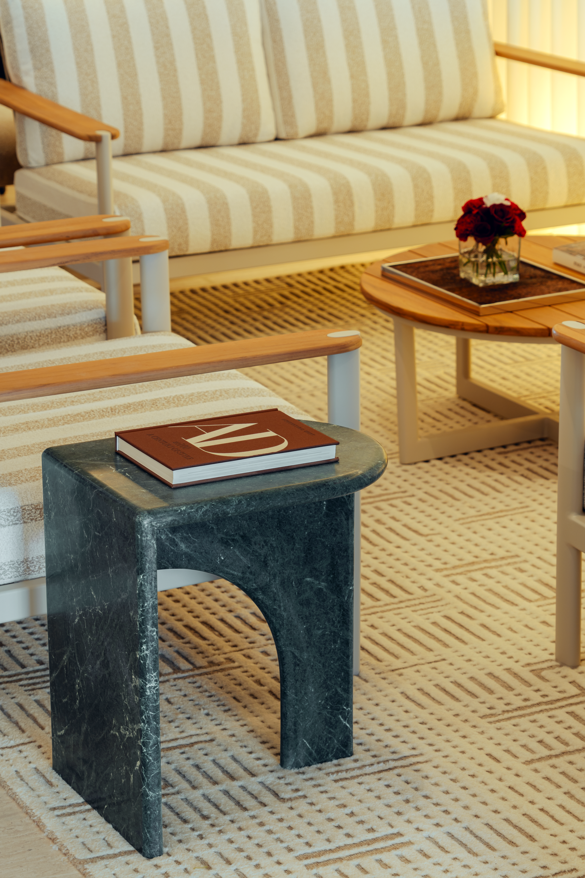 With a 35 cm width, it slips easily beside beds, sofas, or lounge chairs without overwhelming the space. Crafted from a single solid slab of ivory travertine, the design is refined further with increased thickness and a softened, rounded silhouette—bringing material presence in a compact form.
