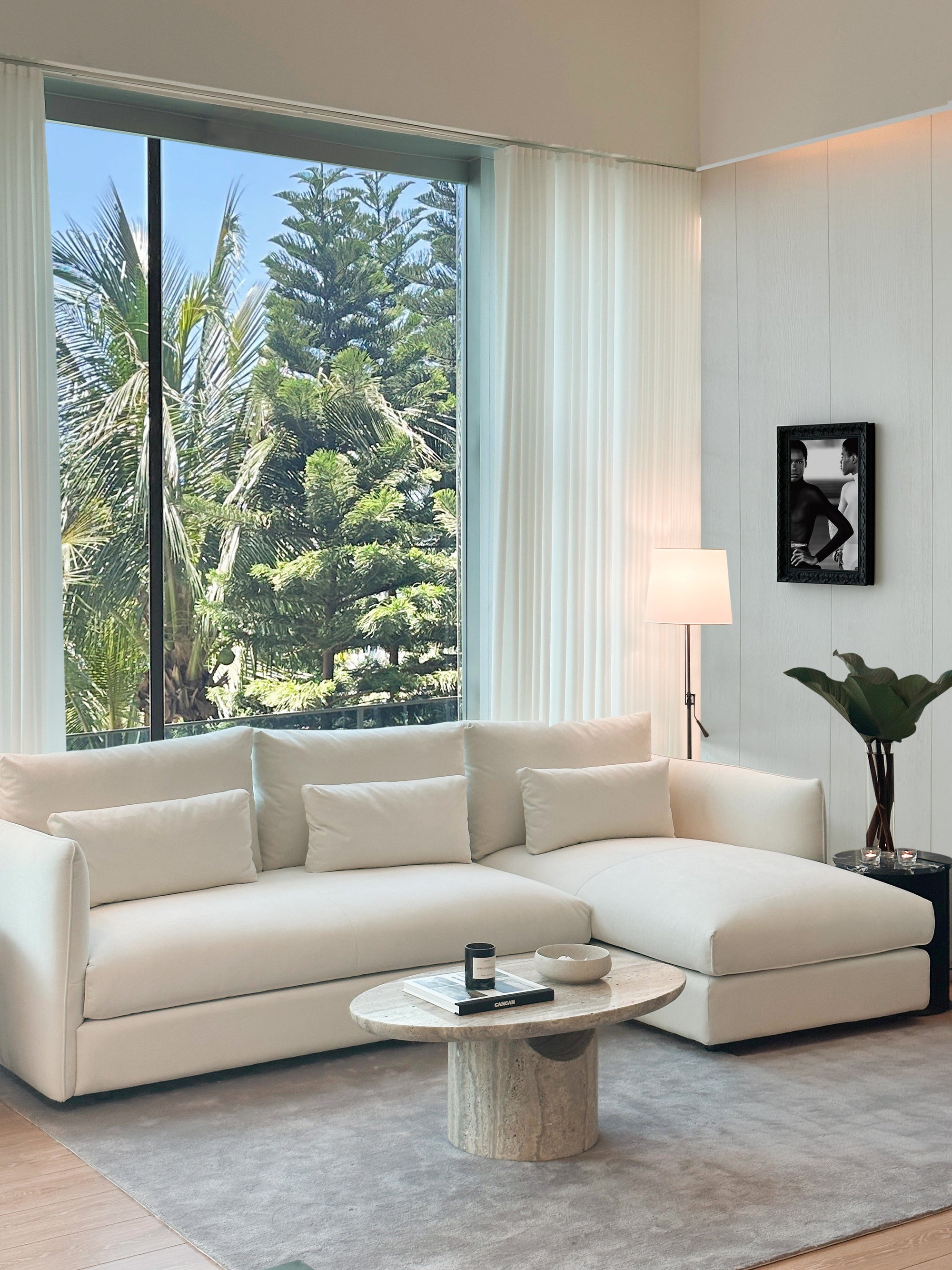 Modern living room with a beige sectional sofa, coffee table, and large windows with a view of palm trees.